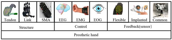 To realize the control of intelligent prosthetic limbs, collecting and analyzing the residual information of upper limbs is the first step in identifying the movement intention. The sources of information, including human sports intentions, include biological electrical signals, motion signals, and voice signals. The biological electrical signals mainly include EMG signals, EEG signals, and EOG signals [72]. Muscle electrical control prosthesis is one of the most widely used prosthetic limbs at present [50,51,73,74]. Although the relevant gesture recognition system based on brain electrical, voice signals, and intentional recognition has been established, in addition to muscle electrical control, there are currently few other control methods that can be used in intelligent control of prosthetic limbs alone [75,76,77,78,79,80]. Other control methods are fusion or feedback with muscle power control methods to increase the intelligent control of prosthetic hands. Table 3 shows some of the control methods, feedback information, and characteristics of some smart prosthetic hands in recent years.