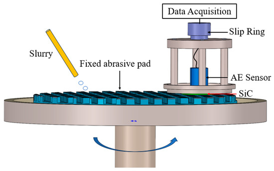 An AE sensor (SAEU3H, QCAE, Guangzhou, China) was mounted on an ultra-precision ring polishing machine (SK-380, Sainko, Dongguan, China) using a self-developed tool to acquire acoustic signals from SiC wafer lapping using a fixed abrasive pad. The sampling rate was set to 6 MHz, and the preamplifier was amplified by 40 dB. The experimental monitoring setup for the lapping process is shown in Figure 1.