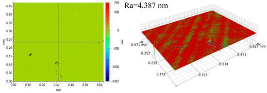 A 4-inch Si-face of 4H-SiC (Jiangyin Lanke Crystal Materials Co., Ltd., Jiangyin, China) was used as a lapping workpiece, and was pre-treated before each set of lapping experiments to achieve a surface roughness of 4 ± 0.5 nm, as shown in Figure 2. The solution used for lapping was deionized water. The lapping pad used in this study is a W40 single crystal diamond fixed abrasive pad provided by Nanjing University of Aeronautics and Astronautics and was trimmed for 5 min before each group of lapping experiments.