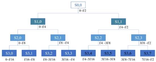 Wavelet packet noise reduction starts with decomposing the original acoustic signal into wavelet coefficients for different frequency bands (Figure 3). Then, the wavelet coefficients of the noise signal frequency band that does not overlap with the effective signal frequency band are identified and removed. Finally, the retained wavelet coefficients are processed using the selected mathematical model. Typically, the wavelet coefficients of the effective signals are significant, while those of the noisy signals are small. Therefore, a threshold value is necessary to distinguish the noise. The T (the threshold value) is calculated as the mean of the absolute values of the wavelet packet coefficients of the noise signal (Equation (5)).