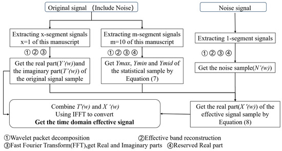 In this approach, m + x segments of acoustic signal samples are extracted from the original signals, and one segment of the acoustic signal sample is extracted from the noise signals. These samples are reconstructed after using wavelet packet decomposition to remove unrelated frequency band signals and are then converted to the frequency domain by FFT to obtain the real part (the fundamental amplitude of the signal) and the imaginary part (the relationship between the phase and time of the signal). The statistical acoustic sample is obtained by extracting the real parts of the m-segment signal samples and then calculating them using Equation (7). The noise sample(N′(w)) is the real part of the noise signal sample. The original signal samples are the real parts and the imaginary parts of the m-segment signal samples. The original signal sample’s real part is denoted as Y′(w) and its imaginary part is denoted as T′(w). The real part of each original signal sample, the statistical sample, and the noise sample are calculated using Equation (8) to obtain the real part(X′(w)) of the effective signal sample. The frequency domain effective signal is obtained by combining T′(w) and X′(w), which are then converted to the time domain effective signal using IFFT. The frequency threshold noise reduction process is presented in Figure 4.