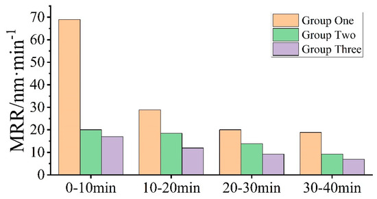 The diamond trimmer is in direct and immediate contact with the fixed abrasive pad, sharpening the surface abrasive grains of the fixed abrasive pad. Additionally, the process results in the shedding of some of the abrasive grains of the fixed abrasive pad. The RMS values of Group Three are significantly higher than those of Group One, as shown in Figure 10 and Figure 12, while the values of the MRR are smaller. This inconsistency is mainly due to the deterioration in the state of the abrasive pads, which leads to more noise generation but not necessarily higher MRR. As a result, the linear fitting curves for each group should be carried out independently. If the linear equation between RMS and MRR is not re-established after the fixed polishing pad is trimmed and the previous equation is used, the MRR values predicted using RMS will be significantly off and will not accurately reflect the lapping process.