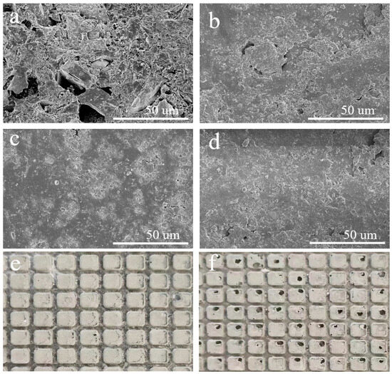 Surface micromorphology of fixed abrasive pads: (a) before the Group One experiment; (b) after the Group One experiment; (c) after the Group Two experiment; (d) after the Group Three experiment; macro-morphology of Group One (e) and Group Three (f).
