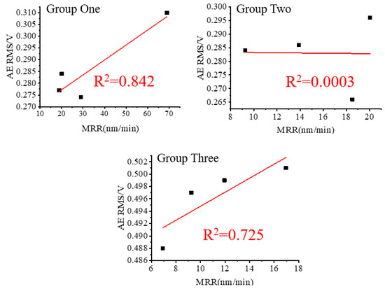 The RMS values (original AE signal) were plotted against the values of the MRR and then linearly fitted to the values of the MRR of the three sets of lapping experiments in Figure 9. As evidenced in Figure 9, the RMS values of Groups One and Three show a better linear fit with the values of the MRR than that of Group Two. Taking into consideration the noise influence shown in Figure 8, one can find that the noise RMS values of Groups One and Three are smaller and smoother, which might be the reason for resulting in a larger R2. Conversely, the noise MRS value of Group Two is larger, resulting in an R2 close to 0. This suggests that noise fluctuation has a significant impact on the accurate measurement of lapping acoustic signals.