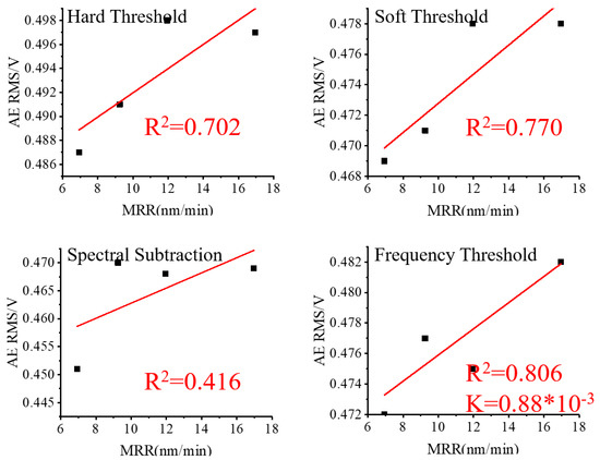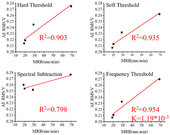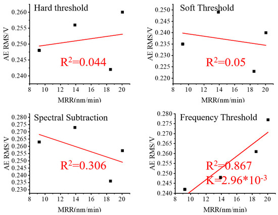To analyze the impact of various noise reduction methods, the RMS values of the three sets of lapping signals after noise reduction were linearly fitted to their corresponding values of MRR and plotted in Figure 10, Figure 11 and Figure 12.