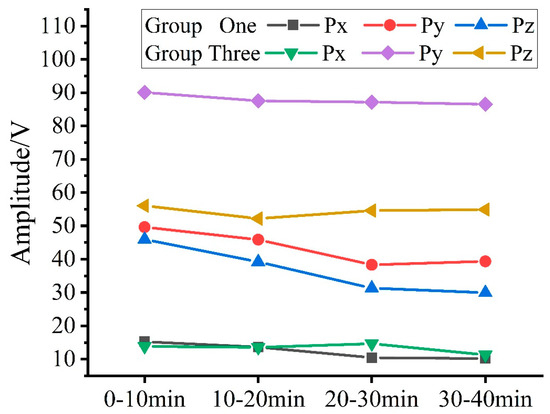 For each segment of the lapping process, three segments of the ‘L’ signal were selected for noise signal analysis. Before it can be used for frequency threshold noise reduction, the original noise signal is reconstructed after using wavelet packet decomposition to remove unrelated frequency noise in the lapping process to obtain the valid frequency band signal, and the RMS values of the valid frequency band signals were calculated and are presented in Table 2, Table 3 and Table 4. Based on the RMS values in these tables, the mean and extreme deviation of the noise signal samples for each segment were calculated as shown in Figure 8. Figure 8a shows that the mean values of RMS values are all different and vary irregularly, indicating that there is randomness in the noise fluctuation, while the mean value in Group Two is larger than that in the other two groups, indicating that the noise fluctuation in Group Two is the largest among the three groups of experiments. As depicted in Figure 8b, Group Two exhibits a significantly higher extreme difference value compared to the other two groups, suggesting greater variation in noise in each section experiment of this group. These results all suggest that the noise appears randomly without any regularity and fluctuates the most in Group Two of the experiments.