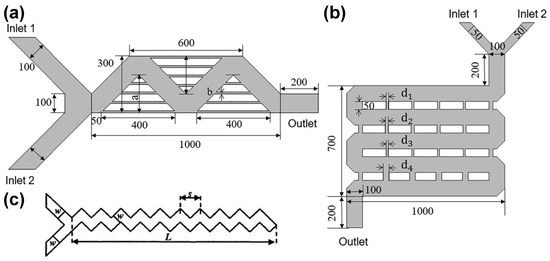 This study selected two classic micromixers as examples and used COMSOL Multiphysics to simulate the concentration fields of the micromixers. As shown in Figure 2a, this is a reference view of the mixer design 1 geometry from the top. The structure has two inlet channels, each 100 microns wide, an outlet 100 microns wide, and three triangular mixing zones with four microchannels, each 5 microns wide, evenly distributed within each triangle. The specific parameters within this mixing zone can be found in Figure 2a. The values of a and b are variable. The design incorporates sawtooth microchannels of uniform width, set at a 90-degree angle to each other. a denotes the linear length of the periodic step, and L represents the linear length of the Z-shaped microchannel. This is the classic Y-sawtooth microchannel structure, a typical passive micromixer structural design [49]. The parameter s is the linear length of the periodic step, and the parameter w is the linear width of the channel, as shown in Figure 2c. To simplify the analysis, the dimensionless parameter s/w is adjusted to enhance the mixing efficiency (the ratio of the minimum to maximum concentrations at the outlet cross-section, /).