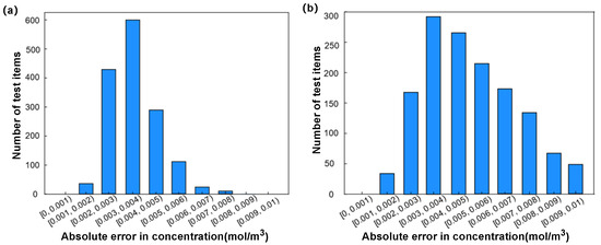 The absolute error distribution diagram of cANN test set: (a) represents cANN1; (b) represents cANN2.