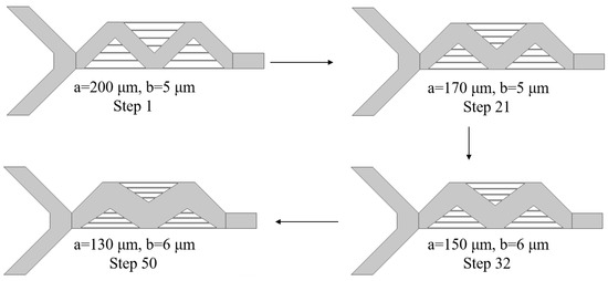From the 50 sets of optimization designs, several were randomly selected to exemplify the optimization process of the DQN intelligent agent for the structural size parameters of mixer design 1. Figure 8 randomly selects four steps from the total 50-step iterative process, demonstrating how the agent adjusted the structural design parameters. The final design was optimized with parameters a = 130 µm and b = 6 µm. Initially, the values of a and b were set at 200 µm and 5 µm, respectively. Throughout the interaction with the environment, the agent continuously learned and optimized its strategy, adjusting the structural design actions. By the 21st step, the parameters were adjusted to a = 170 µm and b = 5 µm. Using the cANN1 to predict the new mixer design structure performance and calculating the reward value based on the reward function, the agent proceeded to the next iteration, ultimately achieving the optimal design of a = 130 µm and b = 6 µm after 50 iterations.