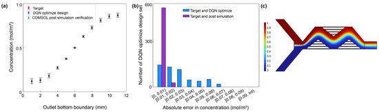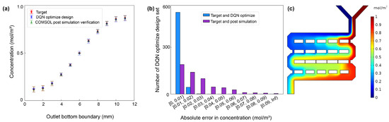 Figure 9b depicts the absolute errors between the target concentration values and the DQN-optimized design concentration values, as well as between the target concentration values and the COMSOL post-simulation verified concentration values. The x-axis showcases the error range, and the y-axis represents the number of occurrences in each interval. The distribution of absolute errors between the target concentration values and the post-simulation verified values shows that more than 94.9% of the concentration points had an absolute error less than 0.01 mol/m3, with 5.1% having an error less than 0.02 mol/m3. On the other hand, the distribution of the absolute errors between the target concentration values and the DQN-optimized design indicated that more than 26.4%, 24%, and 21.1% of the concentration points had an absolute error less than 0.01 mol/m3, 0.02 mol/m3, and 0.03 mol/m3, respectively.