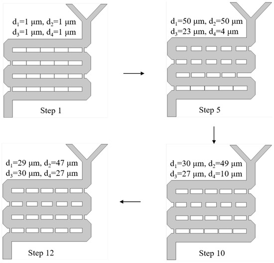 From a selection of twelve optimized designs, several were chosen at random to exemplify the process by which the DQN agent optimizes the geometric structure of mixer design 2 using the reinforcement learning algorithms, based on the target structure’s outlet concentration values. The adjustable parameters for this mixer design are the widths of four microchannels, designated as , , , and , with all other parameters remaining constant. Figure 11 illustrates the process of the agent adjusting the structural design parameters. Four steps were randomly selected from a twelve-step design process. The initial design parameters were set at , = 1 µm, = 1 µm, and = 1 µm. Throughout the interaction with the environment, the agent continuously learned and optimized its strategy, adjusting its actions based on the structural design. Utilizing cANN2, the agent predicted the performance of new mixer design structures and calculated reward values based on the reward function before proceeding to the next iteration. Ultimately, after twelve iterations of design, the agent achieved an optimal design with parameters = 29 µm, = 47 µm, = 30 µm, and = 27 µm.