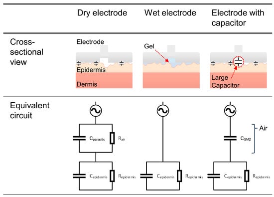 One of the primary challenges faced by researchers is the presence of parasitic capacitance, which typically ranges from 1 pF to 10 nF [34,35,36] and interferes with precise signal measurement [18,19]. The wet electrode is the most commonly adopted solution to such issues since it contains gel components typically containing many chloride ions, which provides reduced impedance and, thus, improved conduction between the skin–electrode interface [37]. Overall, the wet electrodes allow for very high signal quality, less susceptibility to motion, and hence more stable recordings. However, this solution introduces universal problems of non-reusability and limited lifetime due to gel evaporation. The inability to reuse is particularly problematic in underserved areas because of the cost, and hence, the sterilization and reusability of dry electrodes are more common. Additionally, reports exist of problems such as skin irritation or rash with wet electrodes [38,39]. Further, depending on the clinical application, if the gel needs to be applied, for instance, with EEG caps, then there is the inconvenience of added preparation time, cap cleaning, and hair cleaning. Dry electrodes can thus be advantageous, particularly for EEG, since they have a quicker setup and clean-up time. However, there is often difficulty keeping dry electrodes affixed to the skin; they are more susceptible to motion artifacts and, most importantly, more unstable due to the higher impedance and parasitic capacitance. The modified dry electrodes aim to improve on the disadvantages of dry electrodes; however, these solutions have been primarily focused on reducing resistance and potentially enhancing signal magnitude but did not consider signal quality due to uneven parasitic capacitance [17,40,41,42,43,44].