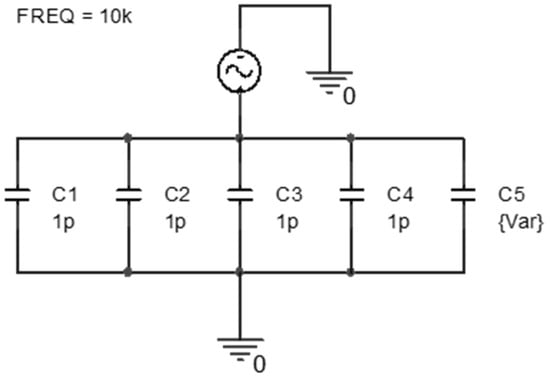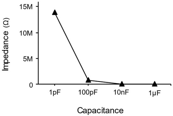 This is because intentionally placing capacitors larger than the parasitic capacitance in parallel ensures that the capacitance remaining between the entire skin and electrode converges to the value of the added capacitor, becoming controllable. Since the added capacitor dominates the total sum, variations in the parasitic capacitance have minimal impact on the overall circuit perspective, resulting in a more stable outcome. In Figure 2, to demonstrate this, the impedance values were simulated by sweeping the value of one capacitance connected in parallel with four other small-value capacitors. As shown in Figure 3, when the value of the capacitor connected in parallel is sufficiently large, the overall impedance converges to a single value. The range of impedance values varies widely with the capacitance, namely for Figure 3; 1 pF corresponds to 13.91 MΩ, 100 pF corresponds to 668.57 kΩ, 10 nF corresponds to 6.95 kΩ, and 1 μF corresponds to 70 Ω.