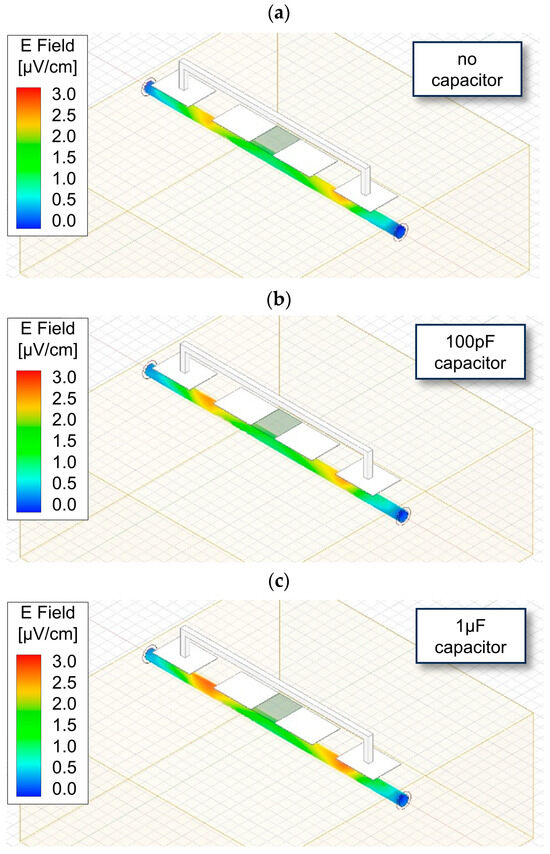 To observe the influence of the add-on capacitor, the setup and results of HFSS simulations are shown: (a) without an add-on capacitor; (b) with a 100 pF add-on capacitor; (c) with a 1 μF add-on capacitor.
