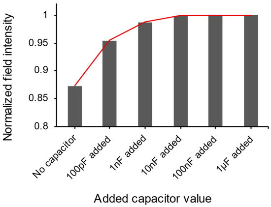 In this study, HFSS simulations were initially utilized to investigate the interface between the bioimpedance circuit and the skin [59,60,61]. Figure 4 shows the HFSS simulation setup and illustrates a reduction in the effect of the parasitic capacitance arising from uneven skin when the add-on capacitor attached to the electrode can be observed [52]. In the first image of Figure 4, the electric field (E-field) flowing along the blood vessels is depicted without the add-on capacitor on the uneven skin surface and shows the E-field from the electrode down the blood vessel is relatively weak, whereas, from the second and third images of Figure 4, the E-field flowing through the blood vessels becomes stronger as the capacitance increases. To further refine this observation, an increase in the add-on capacitance values was performed, and the results regarding the field intensity were observed, as presented in Figure 5. These results show that the normalized field intensity is 0.873 without the capacitor and, with increases in the add-on capacitor, the detected field intensity increases sequentially to 0.954, 0.987, 0.998, 1, and 1. This indicates that the add-on capacitor impacts the mitigation of parasitic capacitance. However, it is notable that beyond a certain threshold, the effectiveness of this mitigation is maximized.