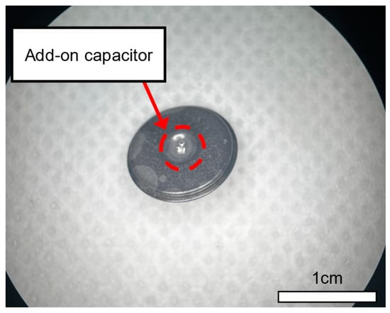 Photograph of the add-on capacitor electrode used in the experiment, which was applied with adhesive silver epoxy.
