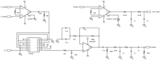 After the current injection, the voltage detected by the detection probe passes through the circuit, as shown in Figure 8. The circuit passes through an instrumentation amplifier (INA) and then through a demodulation integrated circuit (IC). In the demodulation IC, the same method is employed for demodulating amplitude modulation (AM) signals. By multiplying the detected signal by the carrier frequency, which is the same as the injected frequency, the signal is separated into two components: one at twice the injected frequency and the other at 0 Hz [68,69]. Subsequently, the signal goes through low-pass and band-pass filters, and only the original signal is recovered, which is then recorded on the MCU analog input pin [70,71]. The same circuit was applied to all electrodes for this study.