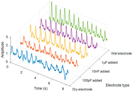 The obtained signals are shown in Figure 9. The experiment compared dry electrodes, electrodes with 100 pF capacitors, electrodes with 10 nF capacitors, electrodes with 1 μF capacitors, and wet electrodes in a single subject. As seen in the figure, there were no significant issues in measuring the pulse rate in all experiments. Regardless of the type of electrode, the heartbeats per minute (BPM) ranged from 75 to 95, within the normal range [72,73,74]. The in vivo systolic amplitude varied with both time and across electrodes; however, the waveform distortion was much higher with dry electrodes and with those with small capacitance.