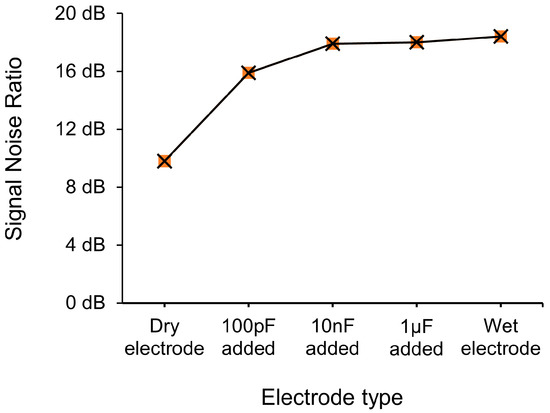 For a more accurate comparison, the spurious signal-to-noise ratio (SNR) was compared in Figure 10 and Table 1, which measures the ratio of desired signal power to unwanted spurious signal power in a system [75]. It was observed that the SNR values increased sequentially from dry electrodes to electrodes with 100 pF, 10 nF, and 1 μF capacitors and to wet electrodes, with values of 9.8 dB, 15.9 dB, 17.9 dB, 18 dB, and 18.4 dB, respectively. This indicates that the addition of a capacitor and its value can improve the signal quality to a level comparable to that of wet electrodes. In particular, the difference between dry electrodes and 1 μF capacitors was 8.2 dB, indicating a significant improvement in signal quality by approximately 6.6 times.