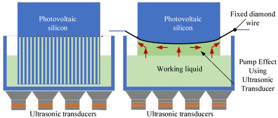 Wire electrical discharge machining is a process that works by continuously feeding a wire electrode under tension. Fluid flow in the kerf machined by wire electrical discharge machining and the fixed diamond wire slicing has many similar characteristics. In multi-wire electrical discharge machining, by increasing the wire running speed, a higher-speed machining fluid flow can be formed around the wire [11]. In addition, a new jet flushing method in which the nozzle is tilted to the wire running direction was investigated; it was found that the tilted nozzle could decrease the debris stagnation area, and the removal rate could be improved [12,13]. Similar measures are also adopted by the fixed diamond wire slicing. Qiu proposed an improved cooling and lubrication method using a water tank bath for diamond wire sawing [14]. The capillary penetration mechanism of the cutting fluid supplied by electrostatic spraying in diamond wire sawing was researched [15]. In addition, the application of nano-silicon carbide cutting fluids in polysilicon cutting was researched to improve the lubrication performance [16,17]. However, methods to further improve the supply of working fluid during machining still need to be explored.
