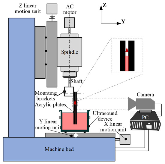 The experimental setup is shown in Figure 2. To facilitate the observation of experimental phenomena, the experimental setup uses two transparent acrylic plates to simulate the kerf. The size of the acrylic plate is 300 mm × 200 mm × 5 mm. The distance between the two parallel plates is adjusted by changing the feeler gauge inserted into the middle of the acrylic plates. A special mounting bracket is designed for installing the two acrylic plates. The designed experimental device is installed on the Z-axis pallet of a three-axis CNC machining center (Shenyang Machine Tool Co., Ltd, Shenyang, China. BRIO Miller 8); the main technical parameters are listed in Table 1. By changing the position of the Z-axis table with a positioning accuracy of 5 μm, the distance between the bottom of the two acrylic plates and the ultrasonic radiation surface is changed.