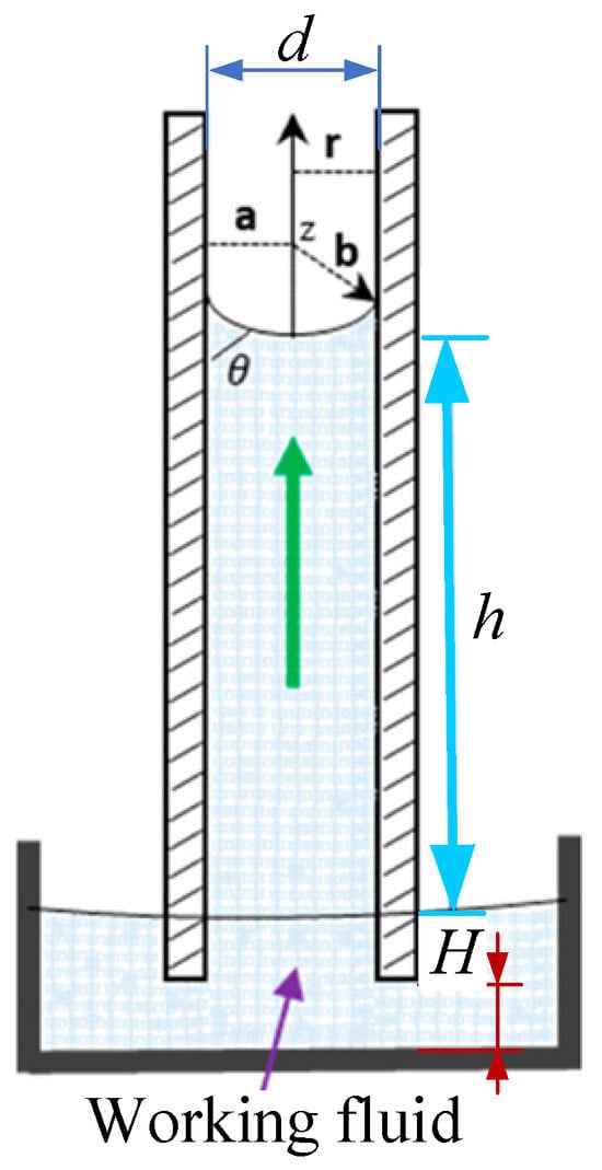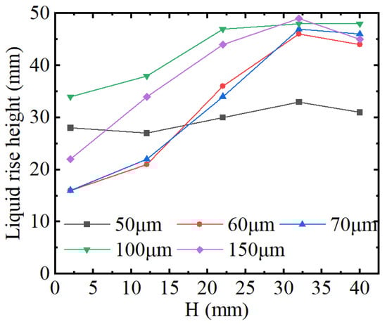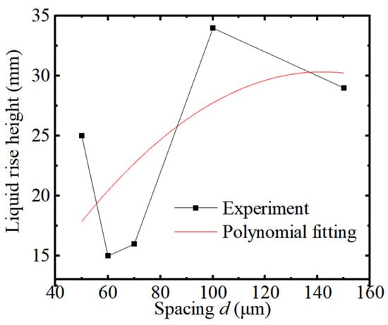 The variation of the liquid rise height vs. the parallel plate spacing d is shown in Figure 4. It can be seen from Figure 4 that the liquid rise height first increases, and then decreases as the spacing d increases, and reaches the maximum rise height at 100 μm spacing d.