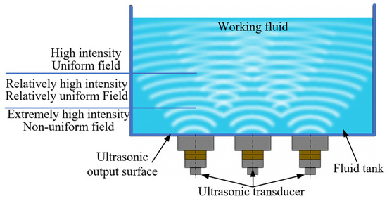 The method for measuring the liquid rise height is as follows: paste flexible scales with 1 mm resolution are glued on the two acrylic plates to record the liquid rise height h. To facilitate the observation of the liquid level position, 1% red pigment by volume rate was added to the working fluid. Distance from the bottom of the parallel plates to the ultrasonic radiation surface is marked as H, as shown in Figure 3.