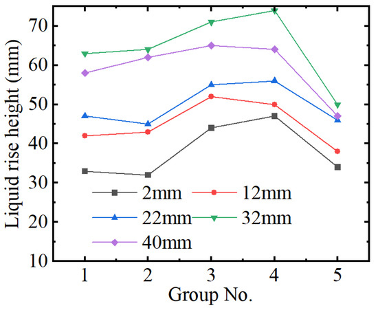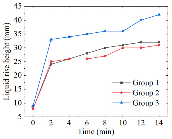 The curve of the liquid rise height with the ultrasonic action time is shown in Figure 12. It can be seen from Figure 9 that the height of liquid rise has the largest increasing rate in the first 2 min, and then decreases rapidly. Compared with the first and the second groups, the liquid rise height in the third group becomes higher. This is because with the increase in the ultrasonic time, the temperature of the working liquid increases and the liquid rise height becomes higher.