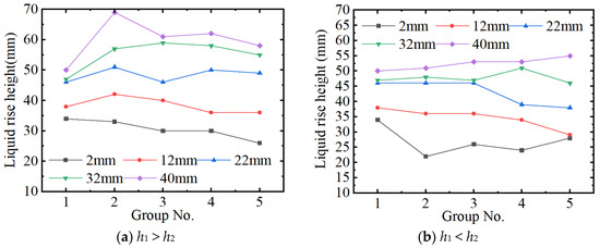 Figure 9 shows the experiment results for the height of liquid rise of h1 > h2 and h1 < h2. It can be seen from Figure 9a that the height of the liquid rise of two parallel plates is lower than that of two non-parallel plates (h1 > h2) for H 22 mm, 32 mm, and 40 mm. For H 2 mm and 12 mm, an opposite rule is shown. In addition, for Group 2 (Up: 0.20, Down: 0.10), the maximum height of liquid rise is obtained.