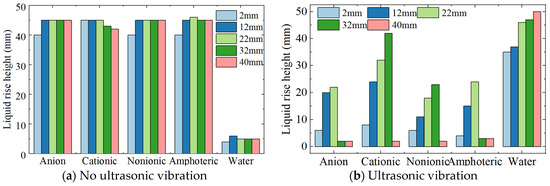 It can be seen from Figure 10b that with the ultrasonic action, the liquid rise height obtained using the cationic surfactant is the highest, followed by anionic and nonionic surfactants, whose rising heights are almost the same. The use of amphoteric surfactants has the smallest rising height.