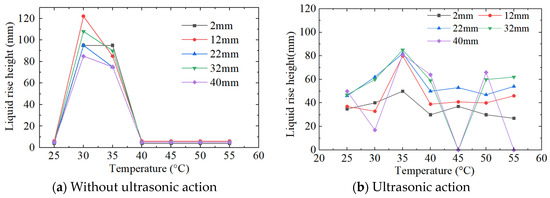 Figure 11 shows the effects of the working liquid temperature on the liquid rise height. It can be seen from Figure 11a that without the ultrasound action, the liquid height between parallel plates has a larger value at 30 °C and 35 °C; at 25 °C and in the range of 40~55 °C, the liquid rise height is small, and is maintained at about 5 mm; in the temperature range of 30~35 °C, the rising height of the liquid is between 60 and 120 mm, and significantly increases.