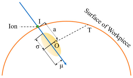 As shown in Figure 2, according to the Sigmund sputtering theory, if the incident ion enters the surface of the element at point I and finally stops at point O, since the ion beam used by the pulsed ion beam adopts a focused ion source, the produced ion beam flux also essentially conforms to a Gaussian distribution. Therefore, the energy deposition can also be considered to exhibit a Gaussian distribution [10,11]. The energy deposited by the incident ions is centered at O within the material and has the following pattern: