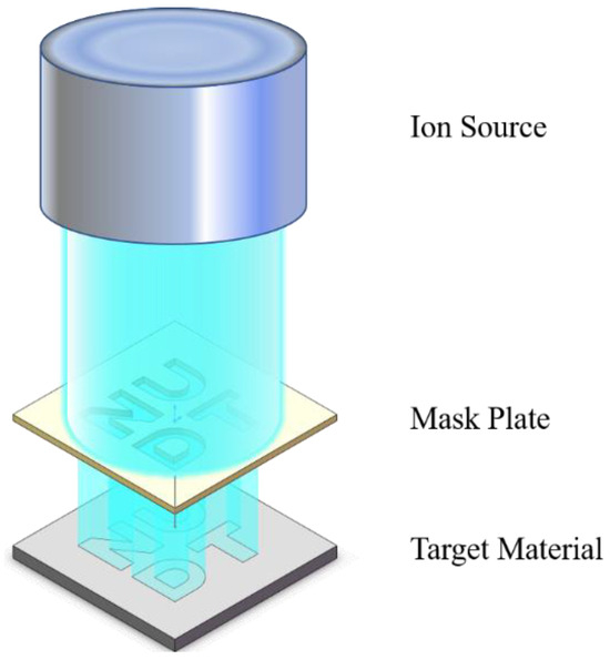 Figure 3 illustrates the specific atomic depth image transfer principle using the PIB process and mask plate. The ion source emits ion beams which, after passing through the mask plate, act on the target material. This process causes sputtering, resulting in the formation of graphics with a specific depth to complete the graphics transfer.