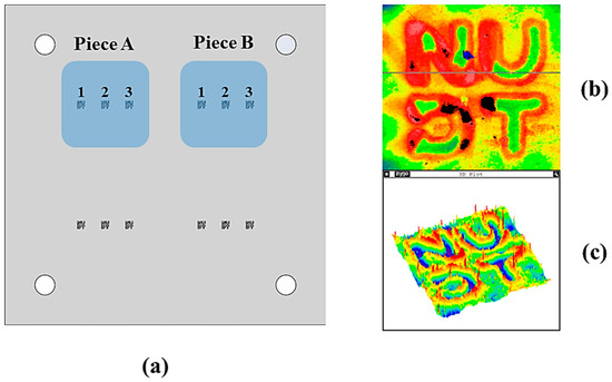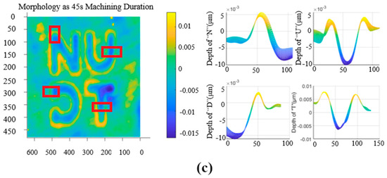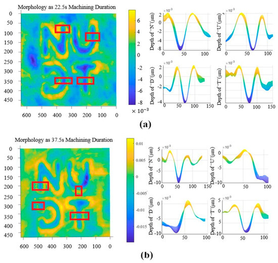 The machining quality of the processed etching area was observed and analyzed in the test. The regions with better processing quality were identified as region 2 of sample A and regions 1 and 2 of sample B, as shown in Figure 5a. Figure 5b,c show the imaging images of the better-etched area and the poorer-etched area, respectively. It has been observed that well-processed patterns are characterized by clear and relatively uniform depths of the etched grooves, whereas poorly processed patterns exhibit extensive deviations in groove depths, non-uniformity, and damage to the etched surfaces.