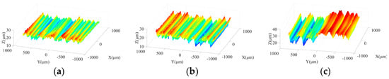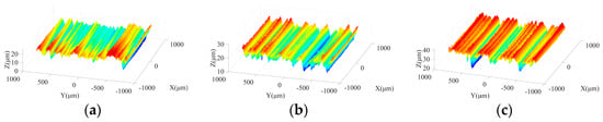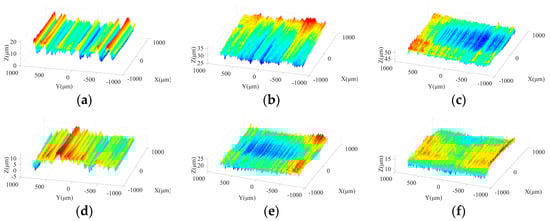 Figure 3 shows the effects of spindle speed on ground surface morphology under different machining steps. As shown in Figure 3a,d, due to the large size and irregular protrusion height of abrasive grains in the rough grinding stage, the abrasive particles tend to leave grooves on the machined surface with considerable depths. With increasing spindle speed, the crest height and trough depth on the ground surface present a downward trend and grooves with a large depth are reduced, which is beneficial to improve the surface quality. In the semi-finishing grinding stage, resulting from the employment of the grinding wheel with a particle size of 400#, the average size and the difference among protrusion heights of abrasive grains are effectively reduced in comparison with those in the rough machining stage. Figure 3b,e indicate that a flatter ground surface with shallow grooves can be obtained in this step. As the spindle speed increases from 2000 r/min to 4000 r/min, the machined surface quality is further improved, attributed to the reduction of the maximum contour height and groove depth. Figure 3c,f show that the spindle speed affects the machined surface morphology under semi-finishing and finishing stages in a similar manner.