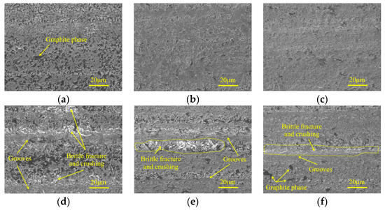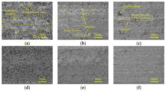 Micro-morphologies under different feed rates in three grinding stages: (a) 240#, 30 mm/min; (b) 400#, 20 mm/min; (c) 600#, 5 mm/min; (d) 240#, 90 mm/min; (e) 400#, 60 mm/min; and (f) 600#, 45 mm/min.