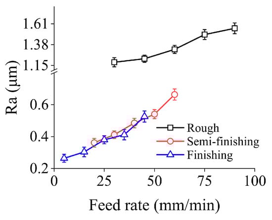 Figure 5 shows the effects of feed rate on the surface roughness in three machining stages. Due to the distinct process targets, the ranges of feed rate adopted under different grinding steps varies. It can be found that Ra presents an upward tendency with increasing feed rate in the parameter range discussed in this study. In the three machining steps, the increment of Ra is 31.62%, 83.43%, and 98.42%, respectively.