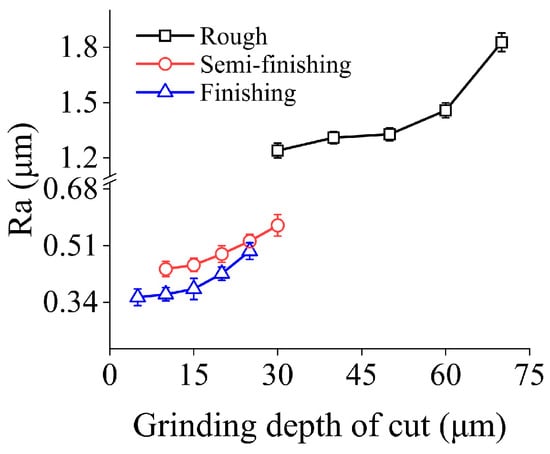 Figure 8 demonstrates the effects of grinding depth of cut on surface roughness under different machining steps. It can be found that within the range of machining parameters discussed, Ra obtained in three machining stages under conservative grinding depth of cut is 1.24 μm, 0.44 μm, and 0.35 μm, respectively. With increasing grinding depth of cut, Ra shows a monotonically growth tendency with increments of 47.34%, 29.77%, and 41.14% in different grinding stages.