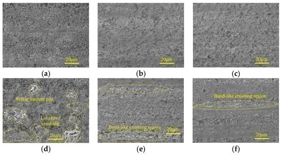Micro-morphologies under different grinding depth of cut in three machining steps: (a) 240#, 30 μm; (b) 400#, 10 μm; (c) 600#, 5 μm; (d) 240#, 70 μm; (e) 400#, 30 μm; and (f) 600#, 25 μm.