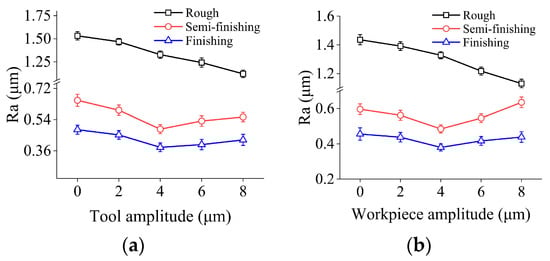 Surface roughness under different ultrasonic amplitudes in three machining steps: (a) effects of tool amplitude; and (b) effects of workpiece amplitude.