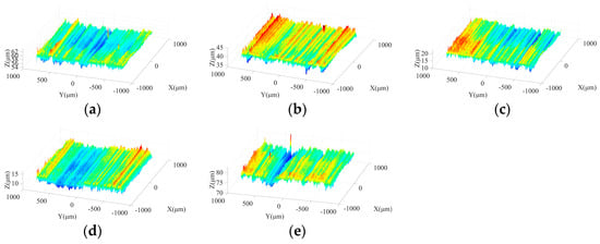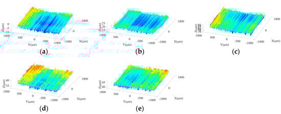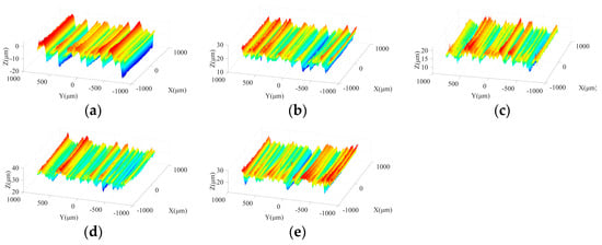 Figure 13 shows the morphologies of machined surfaces under different ultrasonic amplitudes in semi-finishing stage. It indicates that with the increase in particle size, the ground surface quality is effectively improved compared to that obtained in the roughing stage. When the tool amplitude or workpiece amplitude increases from 0 μm to 4 μm, the maximum contour height of ground surfaces decreases, and flatter surface topography can be obtained. However, as the ultrasonic amplitude is further increased from 4 μm to 8 μm, the crest height and trough depth on the machined surface increases again, resulting in a deterioration of surface quality. Meanwhile, as presented in Figure 13a,d, when only one-dimensional ultrasonic vibration is applied, axial tool vibration is beneficial to avoid the appearance of grinding grooves with large depth on the machined surface compared to tangential workpiece vibration, contributing to the improvement of surface quality. Similar to the roughing stage, the comparison between Figure 13c,e shows that when a large workpiece amplitude is adopted, the depth of partial troughs on the machined surface increases due to the impact behaviors of active grains, which further leads to the surface quality degradation. Therefore, the selection of excessive workpiece amplitude should be avoided in the machining process. In addition, Figure 14 demonstrates that the influences of ultrasonic amplitudes on the machined surface morphologies in the finishing grinding stage are similar with those in the semi-finishing step.