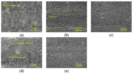 Micro-morphologies under different ultrasonic amplitudes in finishing grinding stage: (a) : 0 μm : 4 μm; (b) : 4 μm : 4 μm; (c) : 8 μm : 4 μm; (d) : 0 μm : 4 μm; and (e) : 8 μm : 4 μm.