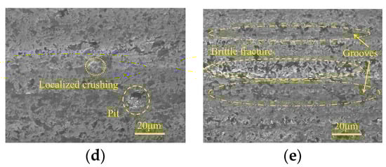 Figure 4 shows the micro-morphologies of ground surfaces in three machining stages under different spindle speeds. Figure 4a,d indicate that in the rough grinding step, SiC is mainly removed by brittle fracture with obvious traces. When the spindle speed is 2000 r/min, material crushing with considerable area occurs due to the large, undeformed chip thickness of the individual active abrasive grain. With the increase of spindle speed, the material crushing phenomenon is effectively inhibited, and the machined surface is occupied by numerous irregular micro-pits, leading to an improved surface quality. In the semi-finishing machining stage, attributed to the increased particle size of the grinding wheel and reduced grinding depth of the cut and feed rate, the material ductile remove ratio is considerably increased, which is conducive to suppressing surface defects. When low spindle speed is adopted, grinding grooves with brittle fracture traces along the feed direction can be observed on the machined surface, forming damage regions with a strip distribution. An increase in spindle speed leads to a decrease of the above surface defects, resulting in a smooth and flat machined surface. In the finishing machining step, the influences of spindle speed on ground surface quality are similar to those in the semi-finishing step.
