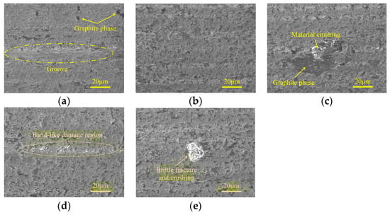 Figure 16 shows the micro-morphologies of machined surfaces under different ultrasonic amplitudes in the semi-finishing machining stage. It demonstrates that when the tool amplitude is 0 μm, despite the fact that the majority of the machined surface is relatively flat and smooth, micro-pits and material crushing still remain in localized areas, forming damage regions with a band-like distribution. As the tool amplitude increases from 0 μm to 8 μm, the surface quality is first improved and then deteriorates with an inflection point at 4 μm. As shown in Figure 16b,d,e, the effects of tool amplitude and workpiece amplitude on the micro-morphologies of machined surfaces are similar. When the workpiece amplitude is increased to 8 μm, the surface defect mainly contains grinding grooves, and the edges of these grooves are accompanied by brittle fracture traces. Figure 17 shows the effects of ultrasonic amplitudes on micro-morphologies of machined surfaces under finishing machining stage and indicates that in the machining parameter ranges discussed in this study, moderate ultrasonic amplitudes are beneficial to improve ground surface quality. When minor ultrasonic amplitudes are employed, the surface defects are mainly composed of localized grooves and band-like damage regions. Meanwhile, when the tool amplitude or workpiece amplitude is large, brittle fracture and material crushing with considerable area are prone to occur around the graphite phase.