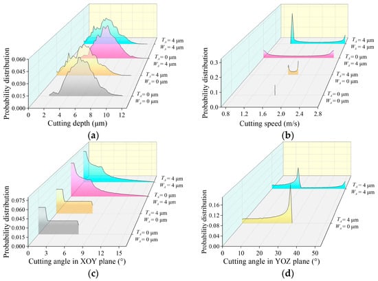 Influences of ultrasonic amplitudes on kinematic features of active abrasive grains [26]: (a) the distribution of cutting depth; (b) the distribution of cutting speed; (c) the distribution of the cutting angle in XOY plane; (d) the distribution of the cutting angle in YOZ plane.