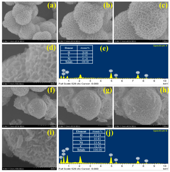 The surface morphology of the synthesized sample has been investigated using field electron scanning electron microscopy (SEM), while the elemental composition was analyzed using energy-dispersive X-ray spectroscopy (EDS). Figure 2a–d displays the surface characteristics of NVO_AFU nanoparticles at magnifications of ×20k, 30k, 40k, and 100k. Figure 2a–d clearly illustrate that the NVO_AFU nanoparticles possess a homogeneous marigold flower-like structure with an average diameter of approximately 2 μm. Figure 2f–i display the scanning electron microscope (SEM) images of the NVO_AFU_rGO composite at magnifications of 20k, 30k, 40k, and 100k. Figure 2f–i clearly show the visible presence of rGO nano-sheets on the pellet of NVO_AFU nanoparticles. This verifies the successful synthesis of the NVO_AFU_rGO composite. Some aggregation is observed in the SEM micrographs of both NVO_AFU and NVO_AFU_rGO nanoparticles. Figure 2e,j display the EDS spectra of the NVO_AFU and NVO_AFU_rGO composites, respectively, along with the elemental composition inset. Figure 2 provides information on the materials. This validates the formation of the stoichiometric phase in the NVO_AFU and NVO_AFU_rGO composites. The energy-dispersive X-ray spectroscopy (EDS) results in Figure 2e show that the stoichiometric ratio of Ni:V:O in NVO_AFU is 45.26:25.95:28.80. Figure 2j shows that the Ni:V:C:O ratio for NVO_AFU_rGO is 13.42:10.81:43.24:35.52 stoichiometrically. This elemental mapping result provides additional confirmation of the creation of the NVO_AFU and NVO_AFU_rGO composite phases, without any presence of impurities. These findings provide more evidence to validate the XRD analysis.