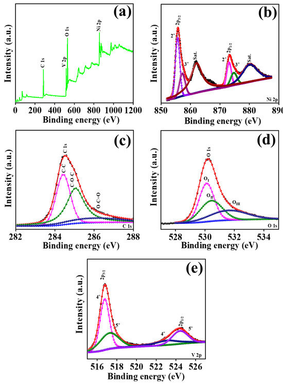 The peaks seen in the survey spectra at 285.90 eV, 529.13 eV, 854.18 eV, and 517.07 eV indicate the presence of carbon, oxygen, nickel, and vanadium in the NVO_rGO composite that was formed. The Gaussian and Lorentzian peak fitting analysis approach was employed to investigate the different oxidation states of nickel, vanadium, oxygen, and carbon. The XPS spectra for the Ni2p orbital are displayed in Figure 3b. The saturation peak is represented by two moderately intense peaks seen at binding energies of 861.65 eV and 880.25 eV. Two prominent peaks are detected at 855.61 eV and 872.34 eV, representing the Ni 2p3/2 and Ni 2p1/2 energy levels, respectively. The distinctive peaks of Ni2+ are assigned to energy levels of 855.59 eV and 873.02 eV for Ni 2p3/2 and Ni 2p1/2, respectively. The distinctive peaks of Ni3+ are ascribed to occur at 857.85 eV and 874.79 eV for the Ni 2p3/2 and Ni 2p1/2 oxidation states, respectively [22,23,24]. Figure 3c displays the spectra pertaining to the C 1s area. The peaks detected at binding energies of 284.04 eV, 285.05 eV, and 286.18 eV in the C 1s region correspond to the carbonate groups C-C, C-O-C, and O-C=O, respectively [25,26]. Figure 3d shows the measured peaks corresponding to the binding energies of 530.09 eV, 530.46 eV, and 531.76 eV for the oxygen atoms OI, OII, and OIII, respectively, in the O 1s area of transition metal (oxy) hydroxides [27,28,29]. Figure 3e displays the V2p XPS spectra of the NVO_rGO nano-composite. The V 2p XPS spectra exhibit two clearly distinguishable peaks at 516.77 eV and 524.37 eV, which correspond to V 2p3/2 and V 2p1/2, respectively. The V 2p deconvoluted spectra exhibited four different peaks: 516.74 eV and 523.11 eV associated with the V4+ oxidation state and 517.49 eV and 524.43 eV related to the V5+ oxidation state [30,31,32,33,34,35]. The XPS results are consistent with the XRD and EDS results, providing confirmation of the presence and creation of Ni3V2O8-rGO.