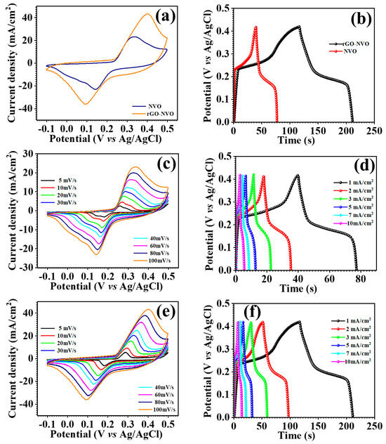 Comparative CV (a), GCD (b) profile, Ni3V2O8 and Ni3V2O8-rGO, CV (c,e) profile at different scan rate, GCD (d,f) at different current density of Ni3V2O8 and Ni3V2O8-rGO electrode.