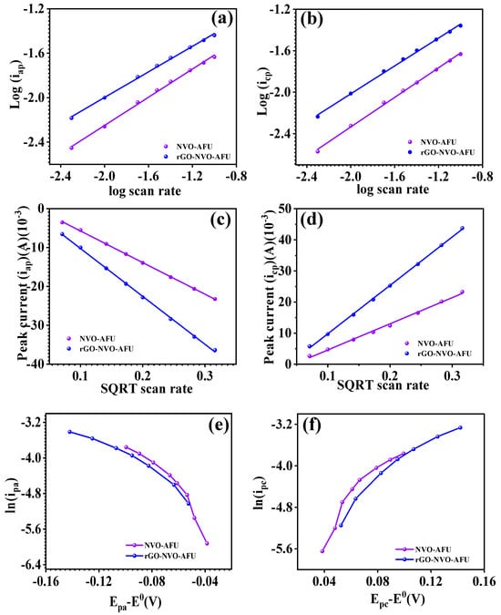 This analysis sought to assess the interaction between the electrode and electrolyte. The EIS spectra of the Ni3V2O8 nanoparticle and Ni3V2O8-rGO composite electrodes were measured in the frequency range of 1 MΩ to 0.1 Ω at an AC voltage of 5 mV, as shown in Figure 5. The region where the EIS spectrum intersects the x-axis represents the series resistance (Rs) of the electrodes. The Ni3V2O8 and Ni3V2O8-rGO composite electrodes had series resistance values of 2.21 Ω and 1.65 Ω, respectively. The Ni3V2O8-rGO composite electrode exhibits superior electrochemical performance compared to the Ni3V2O8 electrode. This is likely attributed to the presence of rGO belts, which enhance conductivity by overlapping the marigold surface microstructure, as observed in the FESEM microstructure analysis. The linear trend observed in the EIS spectra signifies the ideal capacitive behavior and enhanced ion diffusion in the electrolyte. In addition, the kinetics of the electrochemical process were investigated by analyzing the b value, transfer coefficient (α), standard rate constant (k0), and diffusion coefficient (D) of the electrode material [39,40,41,42,43]. The CV profiles of the Ni3V2O8 and Ni3V2O8-rGO composite electrodes were utilized for the computation of these quantities. The b value of the electrodes was determined by plotting the logarithm of the current density (ip) against the logarithm of the scan rate (v), as shown in Figure 6a,b and Equation (4) [39,40]. The slope of this plot corresponds to the b value. The b value denotes the character of the present contribution, where a value of 0.5 signifies diffusion and a value of 1.0 signifies capacitive contributions.