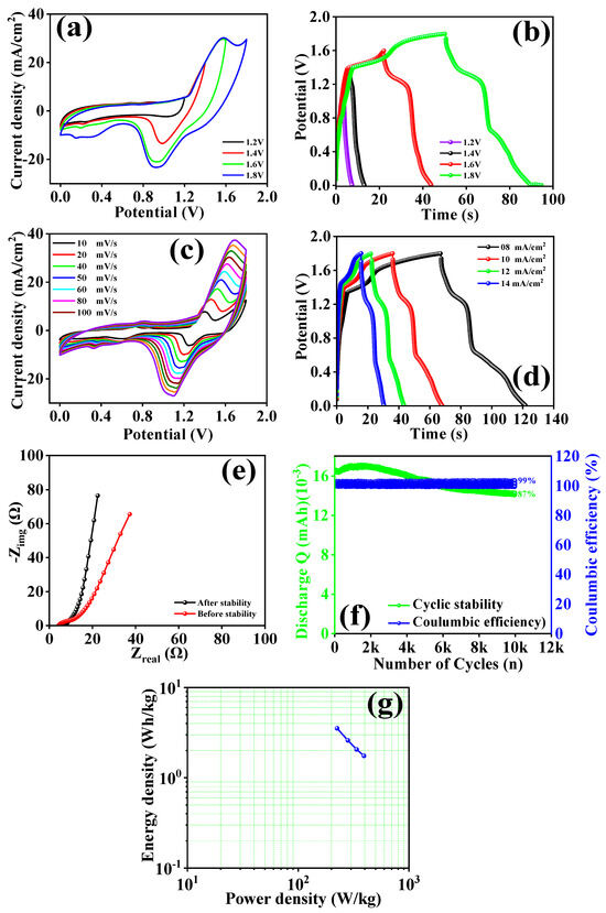 Figure 7a,b illustrate the CV and GCD profiles of the ASC device across different potential ranges from 1.2 to 1.8 V. The CV profile remained stable without any noticeable changes, confirming that the optimal potential for the ASC is 1.8 V. Maintaining a potential of 1.8 V, the rate capability of the ASC was studied by performing CV measurements at various scan rates ranging from 10 to 100 mV/s, as shown in Figure 7c. The consistent increase in current with higher scan rates, without any alteration in the CV profile shape, demonstrated the strong capacitive performance of the device. Figure 7d shows GCD profiles of the ASC at a constant potential of 1.8 V with different current densities ranging from 8 to 14 mA/cm2. The absence of significant distortion with increasing current density indicates that the ASC can operate stably within the potential range of 1.2–1.8 V. Using Equations (1)–(3), the specific capacitance (Cs), energy density (EDs), and power density (PDs) of the ASC were calculated [38,39,40]. The ASC exhibited a specific capacitance of 7.85 F/g, an energy density of 3.56 Wh/kg, and a power density of 225 W/kg at a current density of 8 mA/cm2. The specific capacitance of the ASC decreased with increasing current density due to the non-ideal diffusion nature, which limited the number of ions participating in the process over a given time while using less active material. Electrochemical impedance spectroscopy (EIS) was employed to analyze the electrode and electrolyte interaction of the ASC device before and after stability testing. Figure 7e shows the EIS spectra of the ASC before and after stability testing. In the high-frequency region, the intercept at the x-axis indicates the series resistance (Rs). The ASC exhibited Rs values of 4.27 Ω before stability and 6.63 Ω after stability. The increase in Rs after stability might be attributed to surface modification following prolonged cycling. Additionally, EIS analysis provided insights into the charge transfer resistance (Rct) and the Warburg impedance, which related to ion diffusion. Before stability testing, the Nyquist plot of the ASC showed a smaller semicircle at high frequencies, indicating lower Rct, and a steeper slope in the low-frequency region, signifying efficient ion diffusion.